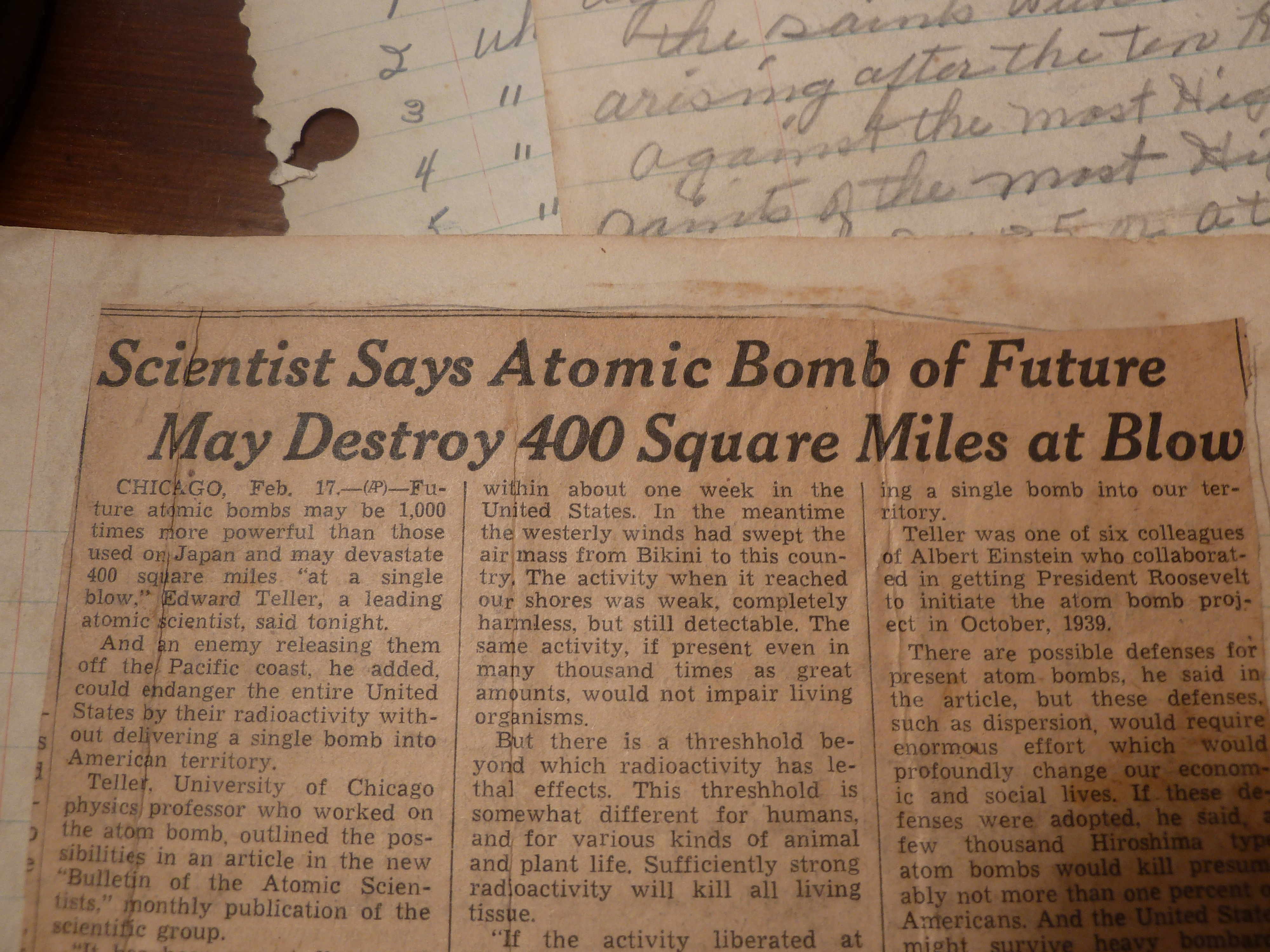 What if that were this mornings headline in the newspaper? It was in February, 1949, when the post-war muscle-flexing was reaching new proportions between the U.S. and Russia. These are my great-grandpa Sears sermon notes with newspaper clippings warning of what could happen if a Nuclear War breaks out between America and Communist Russia.